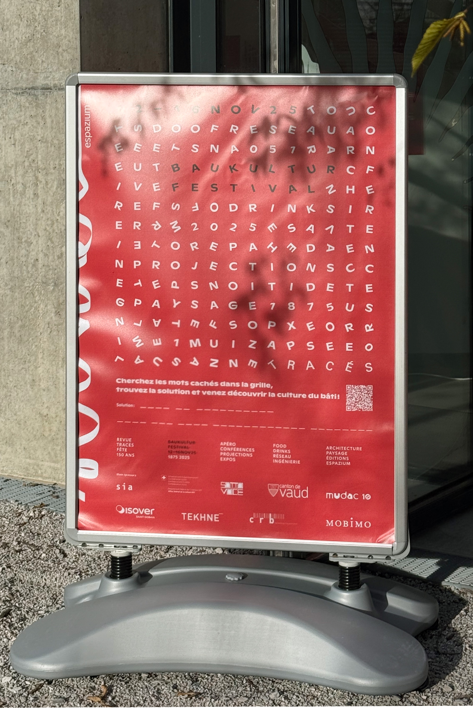 Création de l’identité graphique du Baukultur Festival, un événement tout public dédié à la culture du bâti, organisé à l’occasion des 150 ans de la revue TRACÉS par espazium – les éditions pour la culture du bâti du 12 au 16 novembre 2025 à Plateforme 10, Lausanne.